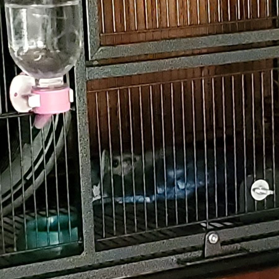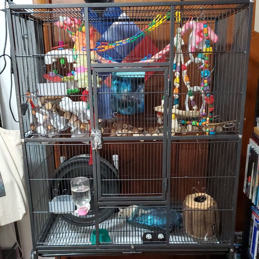 The girls have only been here for a few days, and they are still settling in. Moving can be stressful, even though they are in the same cage as before, so they are staying in my office for now where it is nice and quite. For the first few days I’m not handling them beyond swapping out food and cleaning the cage. That’s why I don’t have terribly great pictures to share quite yet. Remi has been so curious and tries to sneak peeks in there to see them. He has been a very good boy about staying in the doorway and not getting close to the cage.